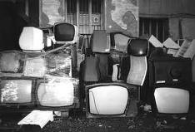 Parte un filmato fatto col cellulare, dove si vedono persone che escono dai palazzi con i televisori in braccio e li posano sul marciapiede, panoramica di marciapiedi pieni di televisori.