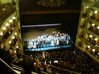 Quello che mi ha colpito di più ieri è stato il perfetto amalgama delle parti, in una parola “l’insieme”, e ciò è avvenuto grazie ad un cast di primo livello, alla direzione di Muti, ma anche al regista Peter Stein, che è davvero riuscito ad essere fedele alla partitura ma allo stesso tempo moderno e “originale” (uso questa parola con qualche imbarazzo perché i registi “originali” sono in genere da evitare peggio della peste; in questo caso invece l’originalità è stata nel modo intelligente e sapiente in cui ha usato i mezzi a sua disposizione non per deformare la storia ma per arricchirla). La scena di base era completamente nera, in pieno stile shakespeariano, incentrata sulla recitazione ma anche con begli effetti di luce e parecchi altri effetti scenici… talmente grande mi è parsa la cura dei dettagli che sarebbe quasi impossibile descrivere tutto lo spettacolo (spero vivamente ne facciano un DVD), posso comunque dire che il momento che più mi ha emozionato è stata la morte del re Duncano. La scena si era lentamente riempita di servitori con delle fiaccole dalle fiamme (vere) estremamente vivide che si stagliavano con grande effetto sulla scena nera e buia. Poi quando Banco grida: