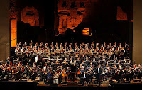L’Aleksandr Nevskij, nato come colonna sonora dell’omonimo film di Ejzenštejn, è una partitura sanguigna, di sapore arcaico, intrisa del sangue e del dramma terribile della guerra: sia quella evocata dal medioevo russo, nella quale il condottiero Nevskij sconfisse l’esercito teutonico; sia quella che incombeva in quegli anni (il film è del 1938). La musica era commentata dalle immagini, eleganti e suggestive, realizzate da Pier’Alli, e proiettate su un grande schermo alle spalle del coro. Dominava, soprattutto nei momenti di maggior impatto sonoro, il rosso del fuoco, con immagini di battaglie e devastazioni. Non sempre però, se devo fare un piccolo appunto, le immagini riuscivano a seguire gli improvvisi scarti della musica di Prokof’ef. Negli interventi del coro e del mezzosoprano sarebbero certo stati graditi i soprattitoli. Buffa, e forse evitabile, l’apparizione, a un certo punto, per una distrazione tecnica, delle icone del desktop sopra le proiezioni.