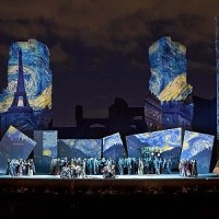 Lo sciopero non ha potuto invece scalfire la regia, le scene, i costumi e le luci di David Livermore. Sotto questo aspetto è stata una delle migliori Bohème che abbia mai visto. Lo spettacolo infatti è ricchissimo di trovate discrete e al servizio del libretto, che danno alla scena un tono vivo, moderno e al contempo fedele allo spirito originario dell’opera. Simpatici i due allegri camerieri che seguono l’arrivo di Shaunard e poi ritroviamo da Momus, carina l’idea di far ritrovare Rodolfo e Mimì sul divano in mezzo alla piazza all’inizio del secondo quadro, audace variante di far spegnere a Mimì la candela da se stessa (assecondando in questo modo, suppongo, il temperamento della Remigio). In generale comunque dominano le proiezioni, che, seguendo il corso della storia, dipingono virtualmente dei grandi pannelli alle spalle dei cantanti con quadri famosi o scenografie suggestive. Con queste proiezioni Livermore è riuscito a includere, con un effetto estremamente pittoresco, anche i retrostanti ruderi di Caracalla, che diventano, tra l’altro, due palazzine del quartiere latino con i comignoli fumanti nel primo quadro, e vengono innevati nel terzo. In generale Livermore ha dimostrato grande intelligenza nell’adattare l’opera al luogo e al tempo della rappresentazione e ai cantanti. Nella parte attoriale invece qualche dettaglio perfettibile c’era (per esempio quando il tenore attacca O soave fanciulla non può stare con le mani in tasca… o quando Musetta ha il «crampo al piè» dovrebbe essere circondata da uomini che cercano di toglierle la scarpetta, oppure nel finale la disposizione dei personaggi sulla scena mi è parsa poco naturale), piccole cose, comunque, che non intaccano la magia dello spettacolo.
