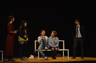 In scena ci sono 5 attori e l’essenziale: uno scheletro di divano e puri elementi geometrici.