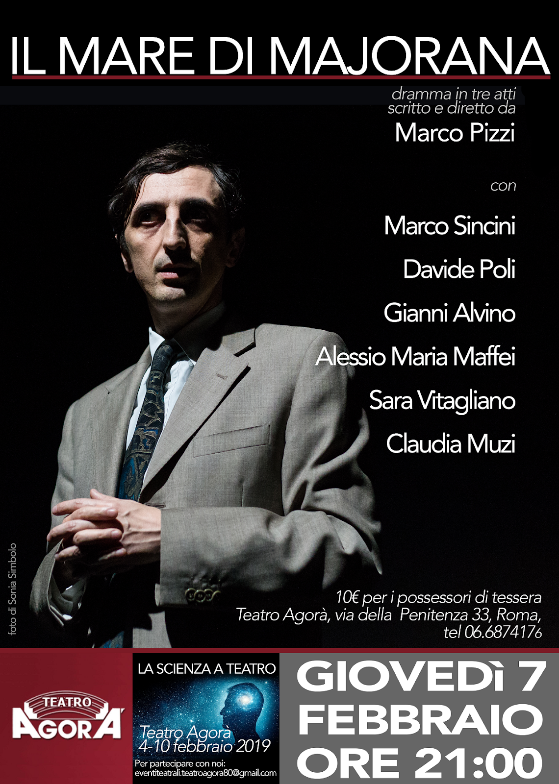 Siamo lieti di annunciare che lo spettacolo andrà di nuovo in scena giovedì 7 febbraio alle 21:00 al Teatro Agorà, via della penitenza 33 (Trastevere) nell’ambito del festival la Scienza a teatro. Per info e prenotazioni scrivere a ilmaredimajorana@gmail.com
