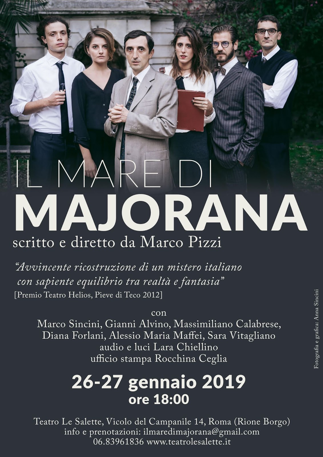 Sono lieto di informarvi che Il mare di Majorana sarà di nuovo in scena il 26 e 27 gennaio al teatro Le Salette in vicolo del Campanile 14 (a due passi dalla Basilica di S. Pietro, metro Ottaviano).